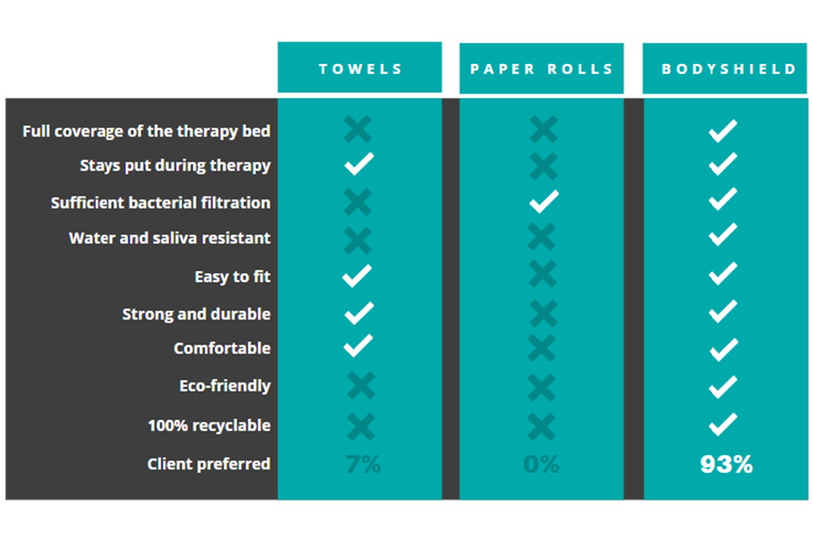 Both clinically and scientifically proven to reduce the transmission of bacteria by more than 90% and with its patent pending, it’s no wonder our BodyShield is preferred by leading and progressive therapists around the world.